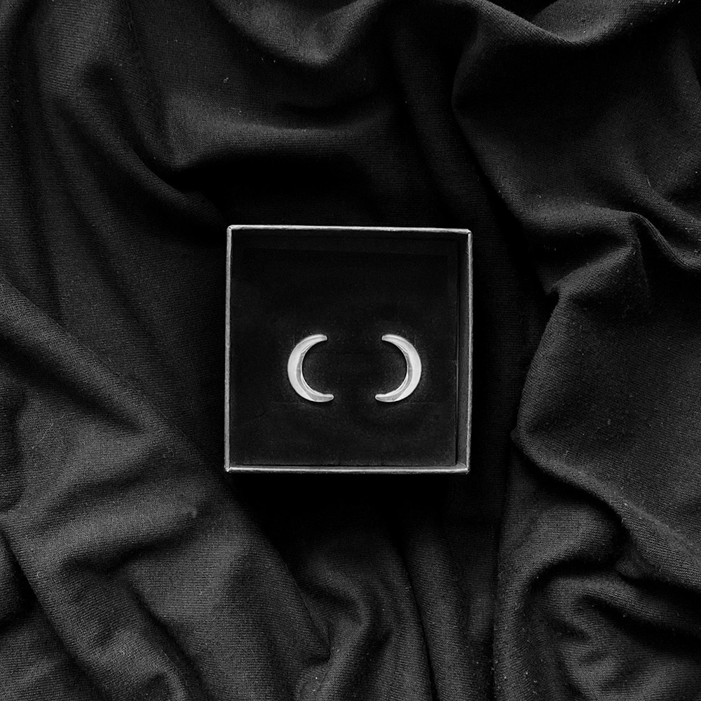 Perfetti da soli per un look dark minimal, ma ideali anche in combinazione con altri piercing o orecchini per creare layering lunari più intensi.
