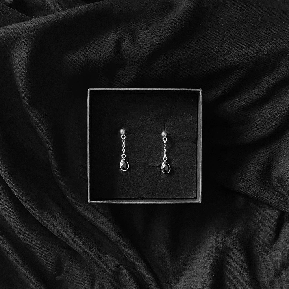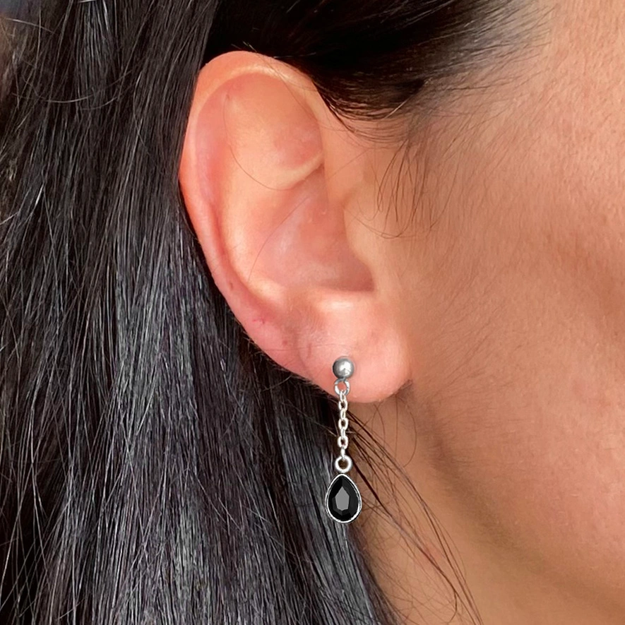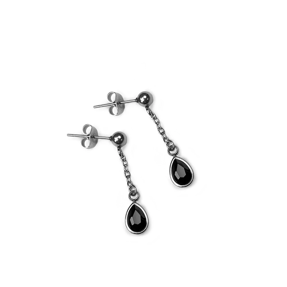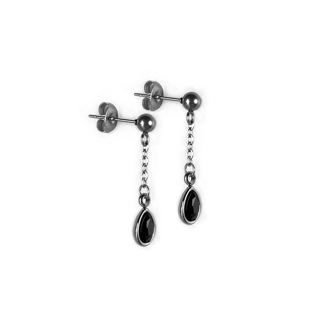 Gli Orecchini Black Light sono degli orecchini a perno con catenina sottile e pietra nera sfaccettata pendente taglio goccia.
